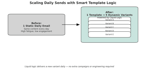 Our most popular email template was sending out with the same content to users every single day. This ran the risk of creating user fatigue, and causing these messages to go directly into the trash. How can we scale up our program effectively without the help of engineering or expensive AI?